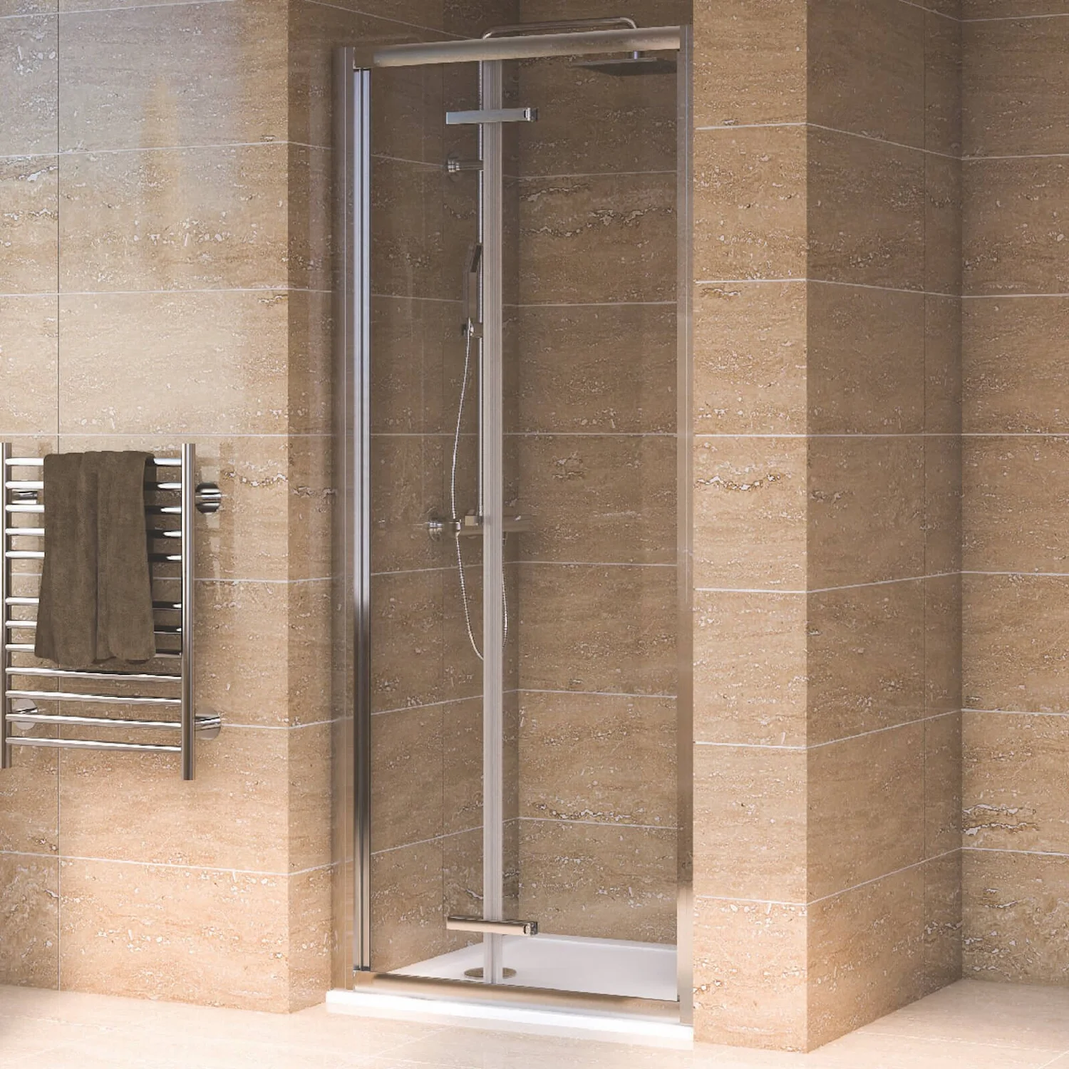 Semi-frameless, polished silver-effect, aluminium enclosure. Provides a sleek finish whilst maximising space with bi-fold door. Aqualux’s 1900 x 900mm bi-fold shower door is ideal for bathrooms or shower rooms where space is at a premium. It features 6mm thick safety glass and a semi frame-less design making it a perfect fit for any bathroom style.