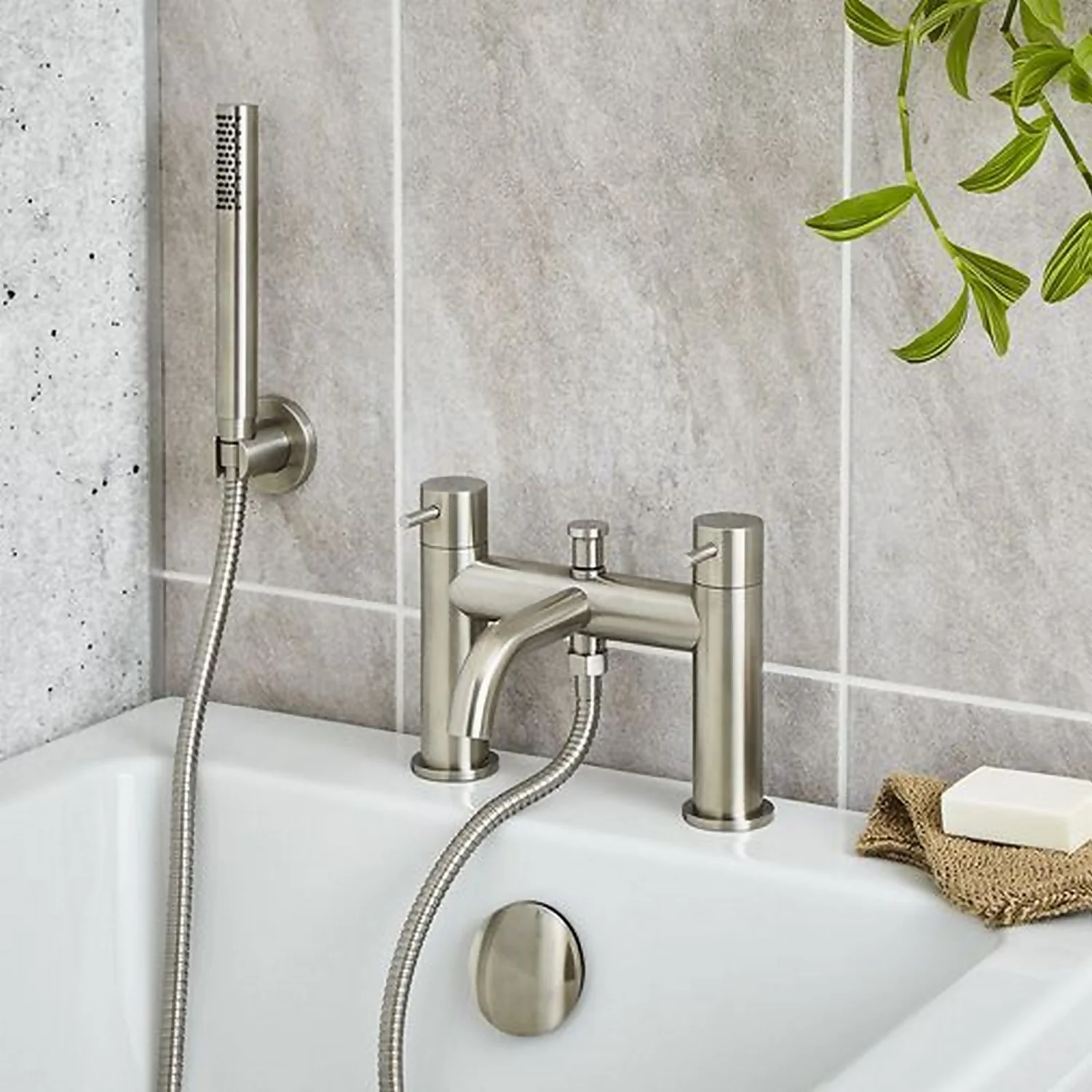 This deck mounted mixer allows you to control water temperature for both a tap outlet and shower handset. It is operated using two handles: one controls cold water while the other controls hot water. It also includes a simple mechanism that allows you to switch the flow of water between the handset and tap.