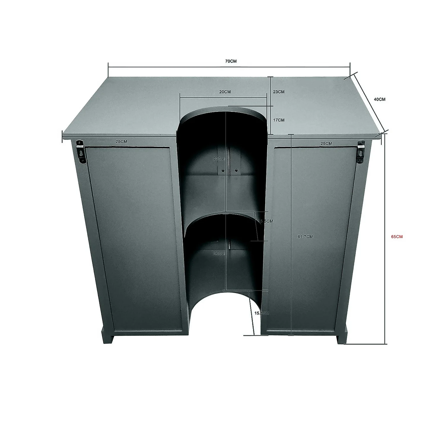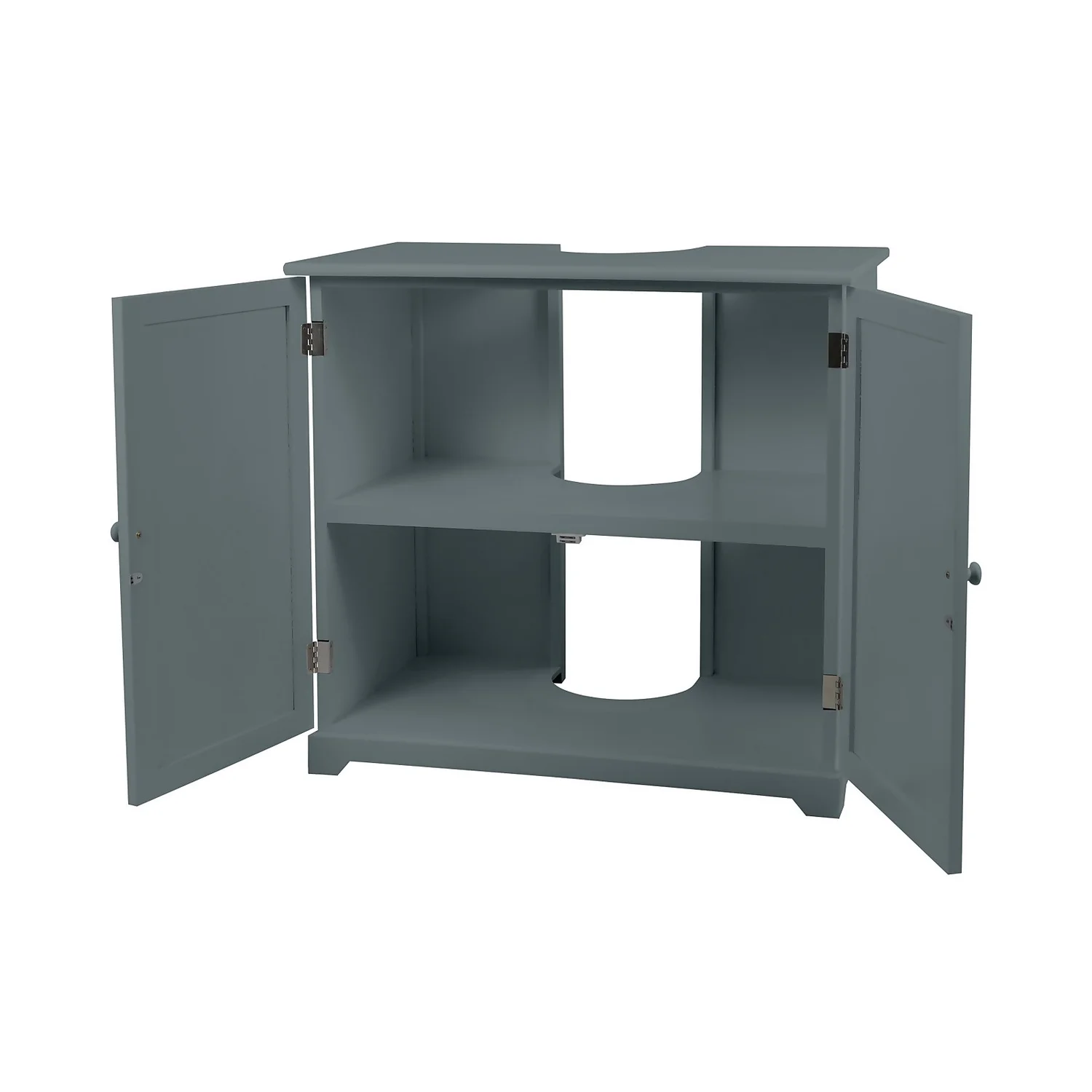 This freestanding under-basin storage unit in a contemporary white features an internal shelf and double doors.
