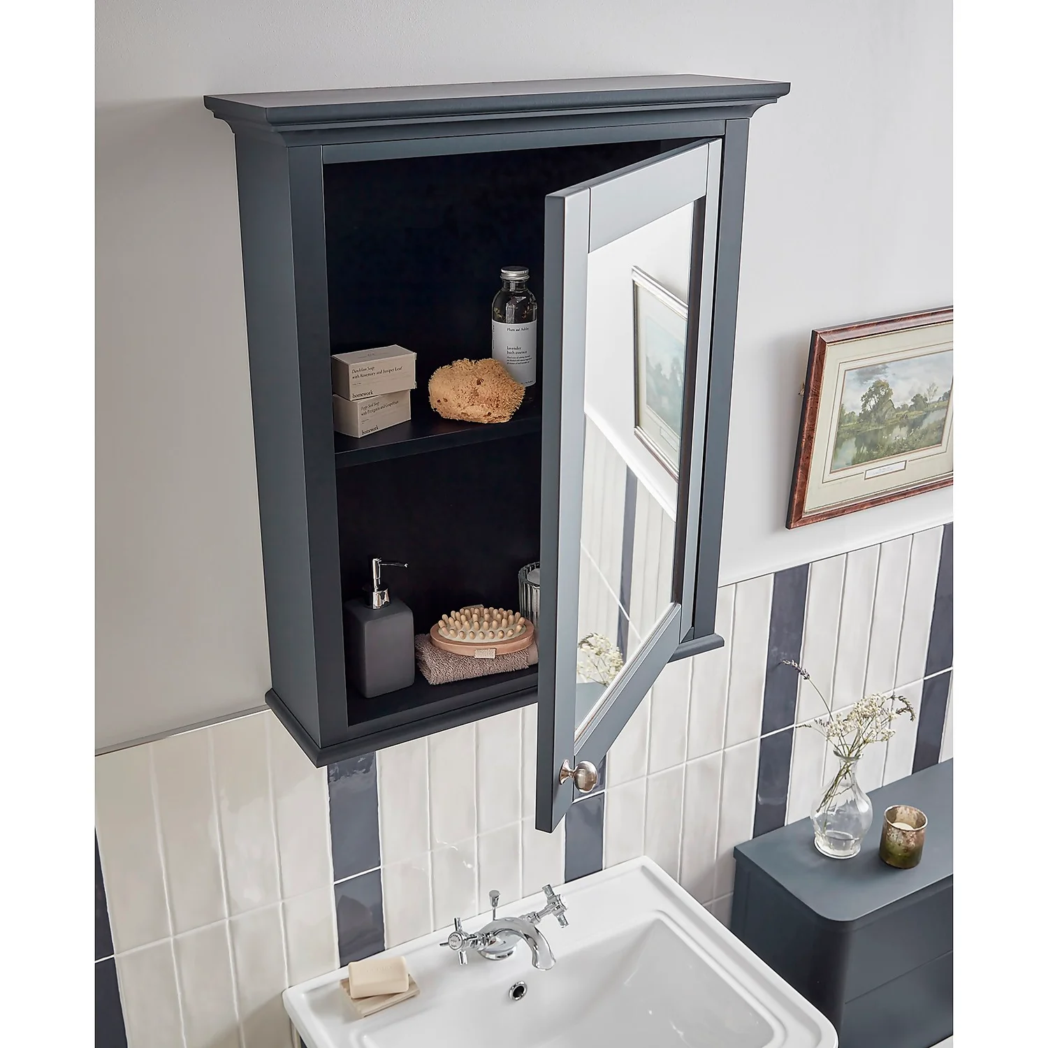 Modern yet classical, the Navy Blue Country Living Wicklow Mirror Cabinet boasts traditional shaker style with a warm wax like feel with a silky touch. This luxurious and durable cabinet is perfect for keeping all your toiletries and bathroom must-haves neatly stored away and your surfaces clutter free. Complete the luxury look by coupling with our Country Living Wicklow WC unit (SKU 642604) and coordinating basin unit (SKU 642600).Also available in Taupe Grey and Matt White. (H) 747 (W) 650 (D) 192.5mm