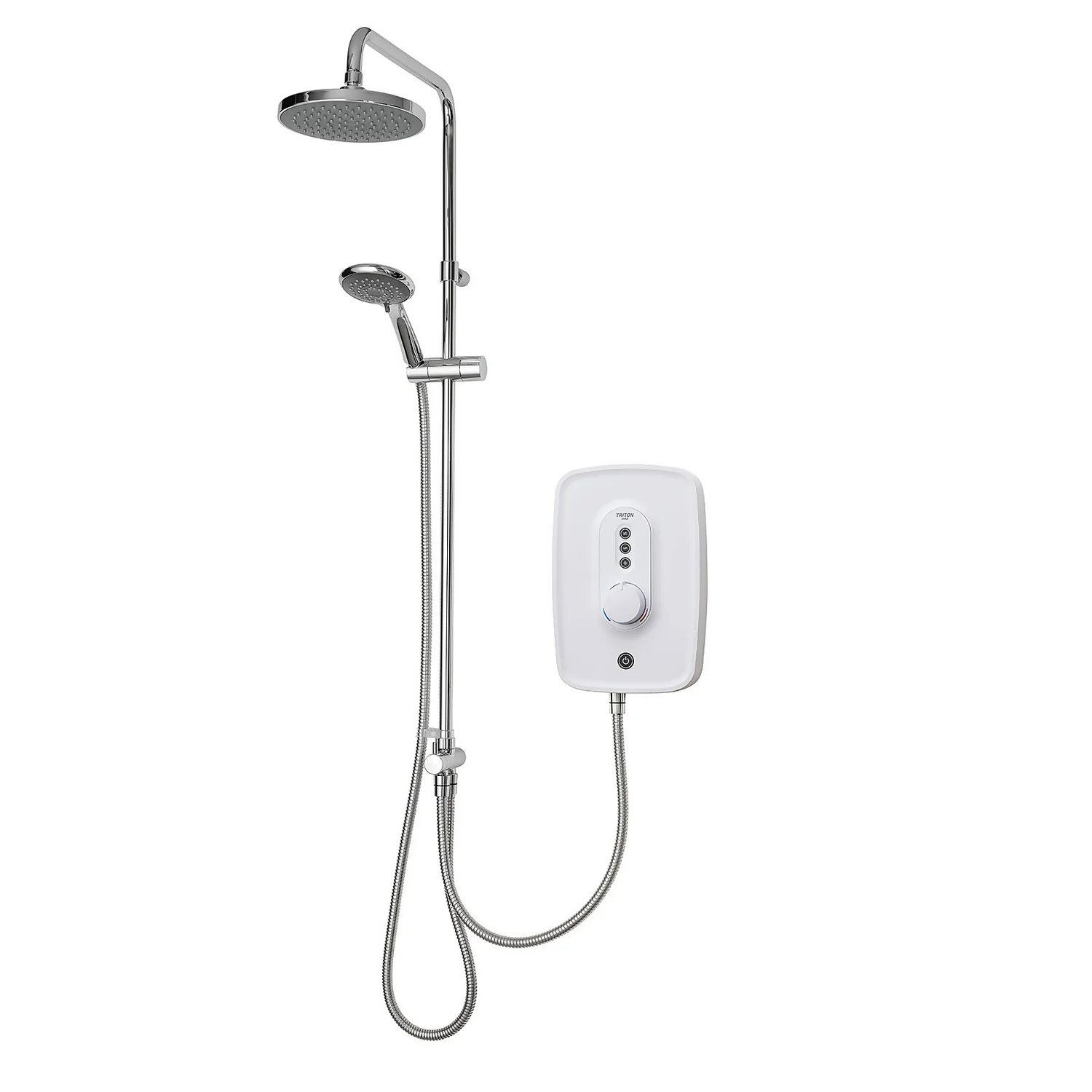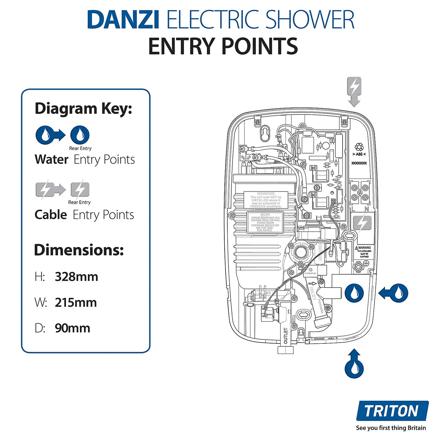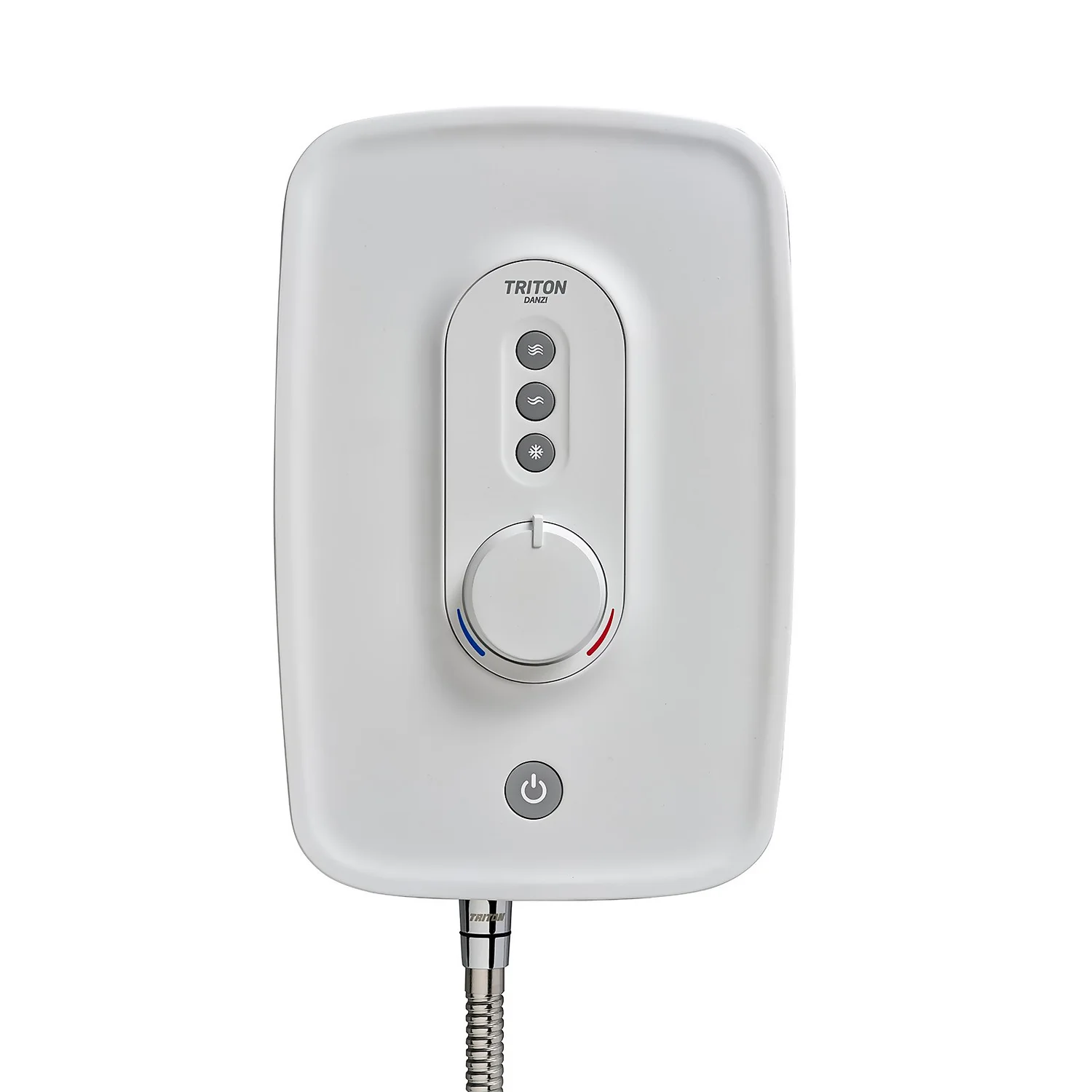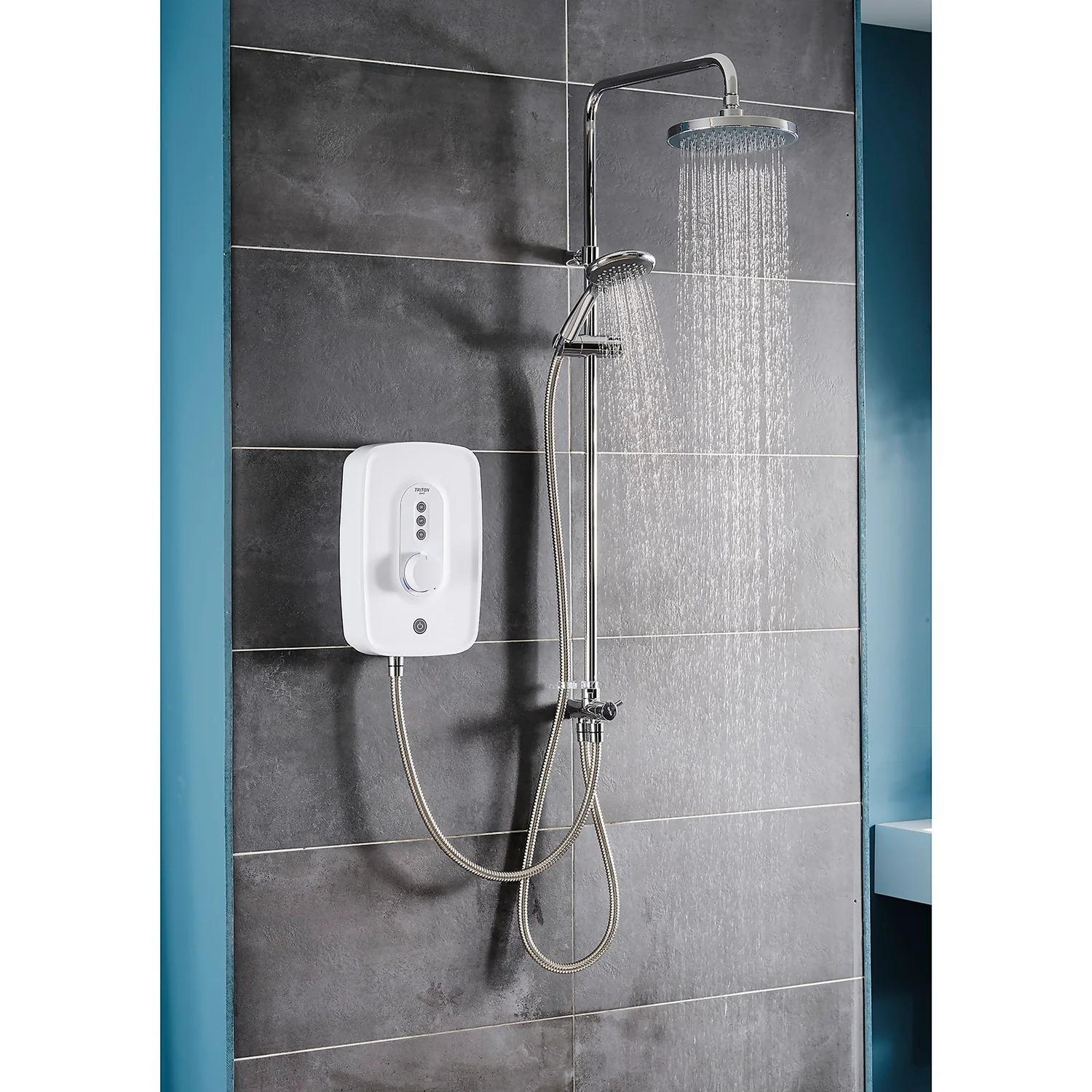 The Danzi Electric Shower offers simple to use style coupled with an array of wonderful features making it a great addition to your bathroom. Select your spray pattern on the handheld shower head from the 5 options including massage and jet spray or drench yourself with the luxurious fixed rainfall shower head or choose both! Power control buttons and a separate start/stop button make this shower super easy to operate with the added benefit of a minimalist look. Phased shutdown flushes out hot water at the end of your shower making it safer and more comfortable for the next user whilst also helping to prevent the build up of limescale.