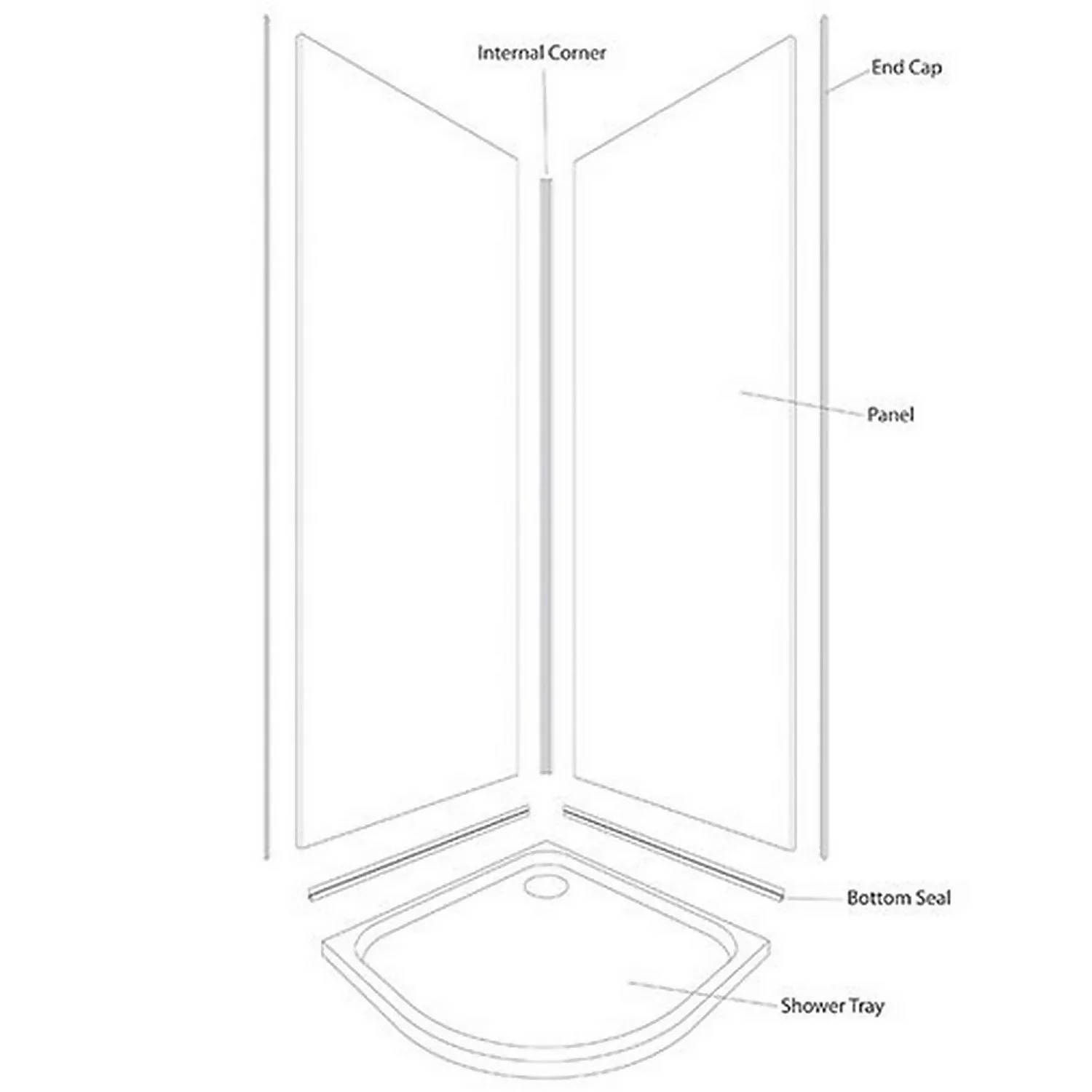 Kit includes: 2 Panels 1200mm wide, 1 Internal corner, 2 End Caps, 3 Adhesive, 2 Silicone, fitting guides and 1 cleaning kit. Shower tray not included.